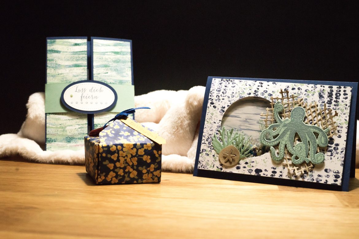 Eine andere Karte, die gar nicht so lange her ist, ist meine Aquariumskarte. Bzw. meine beiden Karten. Denn für den Anlass habe ich zwei Versuche gebraucht. Hier habe ich schon wesentlich mehr experimentiert. Ziel war es eine Geburtstagskarte für einen Aquarium-Unterwasserwelt-Fan zu basteln.